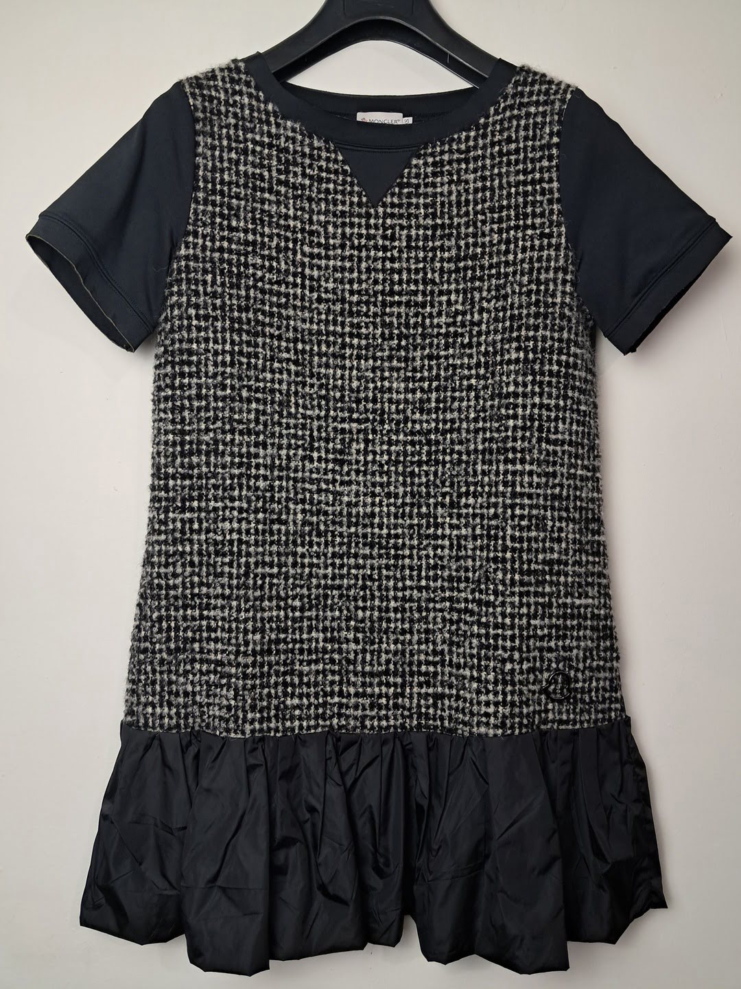 In vendita questo sofisticato abito corto firmato Moncler, un pezzo d'archivio che incarna perfettamente il DNA del brand: il lusso dei materiali classici unito a dettagli tecnici d'avanguardia. Il corpo centrale è realizzato in un pregiato tweed di lana bouclé con trama sale e pepe (nero, grigio e bianco), offrendo una texture ricca e una struttura impeccabile. Il design si distingue per il raffinato contrasto materico: le maniche corte e lo scollo sono rifiniti in tessuto tecnico elasticizzato, mentre il fondo è impreziosito da un'ampia balza a volant in nylon nero lucido, che crea un moderno effetto "palloncino" e dona movimento alla linea a trapezio. Taglia XS