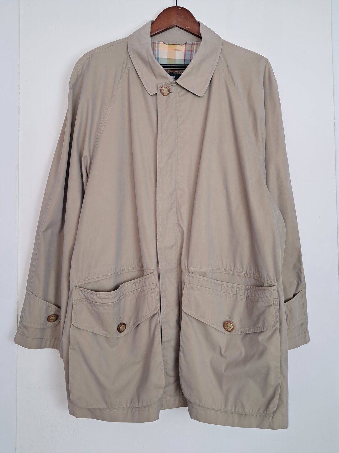 Giacca vintage Corneliani Sportswear in taglia 54 IT, un classico della sartoria casual italiana. Realizzata in cotone beige sabbia, questa field jacket combina un design pulito con dettagli funzionali come le ampie tasche a pattina e la chiusura a bottoni. Il taglio regolare e la manica raglan assicurano una vestibilità impeccabile, mentre la fodera interna a quadri aggiunge un raffinato tocco di contrasto. Un capo versatile e senza tempo, perfetto per un look business-casual o per il tempo libero nelle mezze stagioni.
