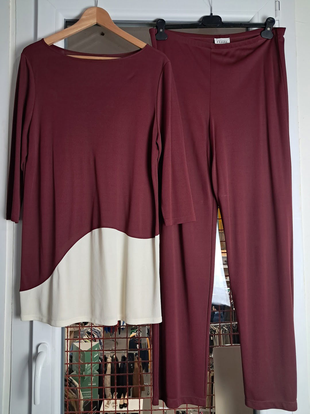Raffinato set due pezzi firmato dalla prestigiosa maison Gianfranco Ferré. Il completo si presenta in una profonda e sofisticata tonalità bordeaux, arricchita da un inserto a contrasto color panna che percorre la tunica con un taglio asimmetrico a onda, studiato appositamente per slanciare la figura e donare movimento al look. La casacca, caratterizzata da uno scollo a barchetta pulito e maniche a tre quarti, è realizzata in una pregiata maglina di viscosa elasticizzata dalla mano serica e pesante, che cade perfettamente senza segnare i punti critici. I pantaloni coordinati, rigorosamente in taglia 46, presentano un taglio a palazzo a gamba larga estremamente attuale, con una pratica vita elasticizzata che garantisce una vestibilità impeccabile e il massimo comfort per l'intera giornata. È un outfit pensato per la donna moderna che cerca un capo versatile e "travel-friendly" che non si sgualcisce, ideale per passare con disinvoltura da un impegno di lavoro a un evento formale o una cerimonia informale. Il set è in condizioni eccellenti, conserva intatta la lucentezza del filato e rappresenta un investimento senza tempo nel guardaroba di chi ama lo stile Made in Italy d'autore.