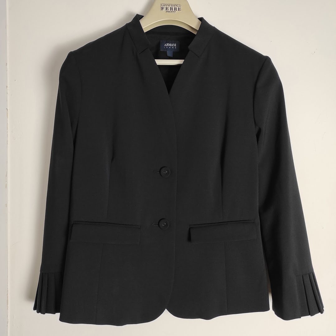 Questa raffinata giacca firmata Armani Jeans, proposta nella taglia 46, incarna un'estetica minimalista e sofisticata grazie al suo taglio sfiancato in un intramontabile nero intenso. Il design si distingue per il collo alla coreana che sfocia in un profondo scollo a V, una scelta stilistica che slancia la figura eliminando i classici revers per un look più pulito e moderno.