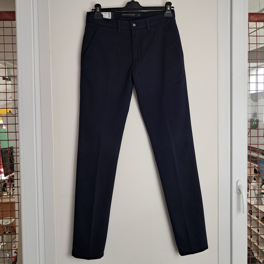 Modello chino sartoriale firmato Harmont & Blaine, caratterizzati da un'estetica raffinata e un taglio slim fit che segue la linea della gamba in modo moderno e pulito. Realizzati in una tonalità classica di blu navy, presentano una chiusura frontale con bottone e zip, passanti per la cintura e tasche laterali a filo che accentuano il design essenziale e versatile. La struttura del tessuto e la piega centrale appena accennata li rendono il capo ideale per un look business casual. Taglia: 46